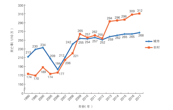 農(nóng)村心血管病死亡率從2009年起超過并持續(xù)高于城市水平。2017年數(shù)據(jù)顯示,不論心臟病(154.40/10萬vs141.61/10萬)、腦血管?。?57.48/10萬vs126.58/10萬),死亡率均是農(nóng)村高于城市。