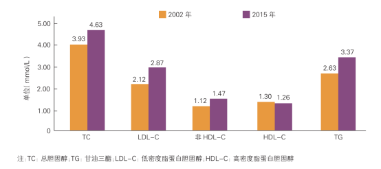 2002年和2015年我國成年居民不同種類血脂水平比較